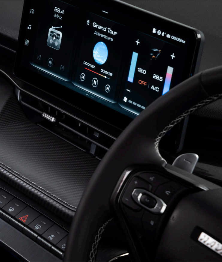 To reinforce its ambitious stance, you’ll find that the interior delivers sophisticated comfort with sporty green trimming and stitching with Alcantara inserts. With a driver-centric design, the HAVAL H6 GT boasts branded and heated seats, a 10.25-inch digital instrument cluster, wireless charging, and a 12.3-inch central display.